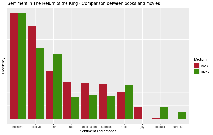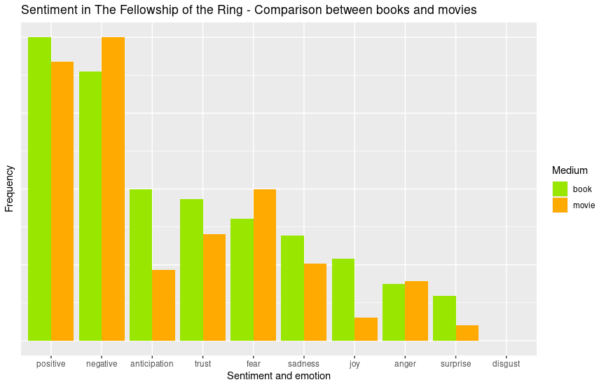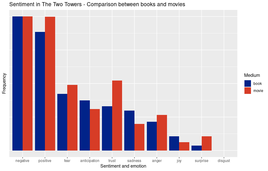 The results show that the scores are similar across most emotions. While there are differences, none are extreme. Tolkien’s linguistic mastery is difficult to match, but in terms of positivity and negativity, the movies and books are nearly identical. The top four emotions across both mediums were trust, fear, anticipation, and sadness.