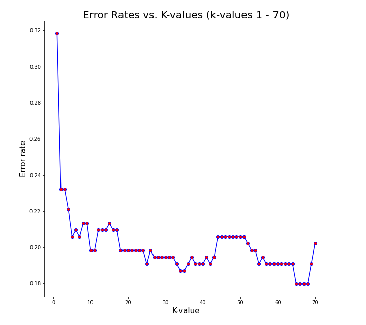 A suitable k-value must be chosen to gain the best possible performance. Each value has a certain error rate, and the k with the lowest score will be chosen. One way of doing this is making multiple models, each with a different value, and plotting the results. Below is a plot with error rates for models with a k-value from 1 to 70.