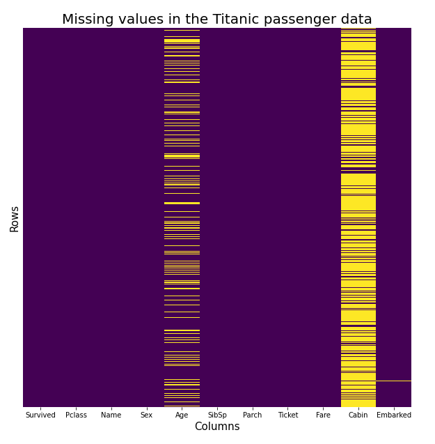 But first I take a look at the data itself. It must not contain any missing values in order to create a trustworthy model. I plotted the data to see the ratio of missing values (yellow bars) for each column in the data.