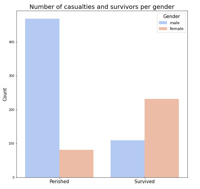 After cleaning the data, I decided to explore the dataset a little further. With some visualizations, made by Matplotlib2 and Seaborn3 for Python, survival rates for different groups became more apparent. The first plot shows the number of people that perished and lives, divided by gender.